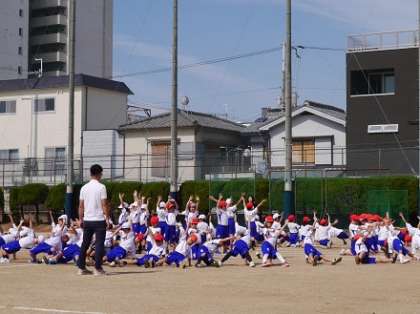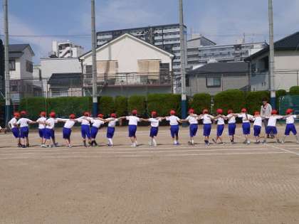 6月6日(月)、今日も素晴らしい天気です。運動場ではまぶしい青空の下で、元気な声が響いています。写真は1、2年生の団体演技練習のようすです。ポーズをきめ、かわいい歌声で、一生懸命歌っています。特に、2年生は1年生のお手本となるよう、大きな声を出してがんばっていました。12日(日)の運動会本番が楽しみです。