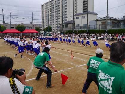 5・6年生と7・8・9年生の団体競技です。騎馬戦は一騎討ちからです。赤組白組それぞれの代表の馬が駆け、武者がバランスをとりながら懸命に手を伸ばし帽子を取り合いました。支える手がしびれて痛くなっても、なんとか武者に帽子を取らせようと馬は頑張ります。三本綱引きはさすがの迫力です。自然と声がでます。こっちの綱で勝ったら、あっちの綱に走ってとびつけ!赤組白組、それぞれの総力戦です。練習では赤組の圧勝でしたが、さて、本番の結果は?おおいに力強さを表現することができたのではないでしょうか。