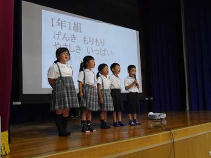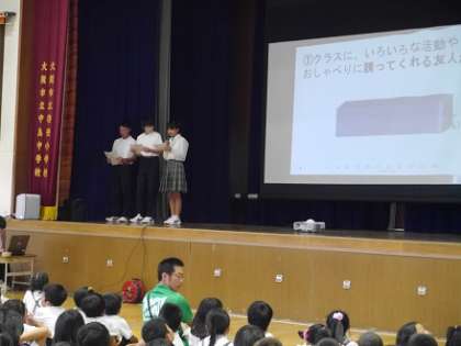まず、1年生から順番に「なかまウィーク」に向けて考えたクラス目標を発表していきました。各クラスとも、堂々と元気いっぱいに発表してくれました。また、7年生から9年生では、「良いクラス・よい学園」にするため、アンケート結果を交えながら、よいところや課題を出し合いました。