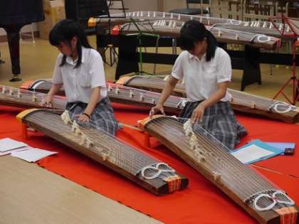 7月19日(火)梅雨が明け、猛暑の1日となりました。放課後、音楽部の皆さんによる「おさらい音楽会」が開かれ、箏の演奏を聴かせてくれました。今回は、4月に入部した5年生・7年生の初めての演奏会です。緊張しながらも、1音1音、丁寧に弦を爪弾き、曲を奏でました。最後の曲「夏祭り」では、全員による演奏で、抑揚のある美しいアンサンブルを聴かせてくれました。