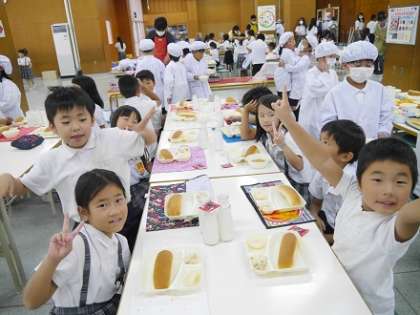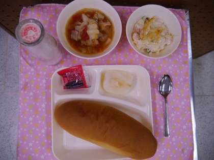 9月2日(金)、ランチルームに「いただきます!」の元気な声が響きわたりました。2学期初めての給食です。やっぱり給食の時間は嬉しそうです。笑顔いっぱいに、楽しそうに食べていました。今日の献立は、「えびグラタン、トマトスープ、なし、コッペパン、牛乳」です。