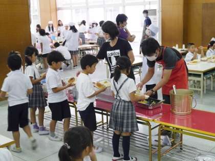今日も、おかわりの行列ができていました。中学生も「温かくて美味しい」と教室で楽しく談笑しながら、給食の時間を楽しんでいました。