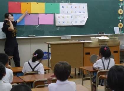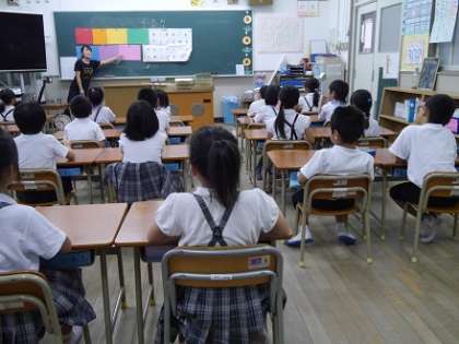 「むくのき学園」では、これまで小・中学校英語教育重点校として、小学1年生から英語教育音声指導(フォニックス)などに取組んできました。今日は、色の名前を英語で歌う活動です。児童の皆さんは楽しそうにからだを動かしながら声を出し、ますます英語を好きになっているようすでした。