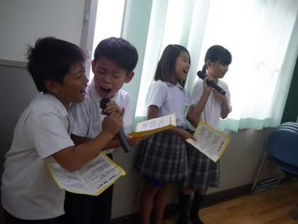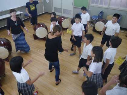 昨日4年生のみなさんは、視聴覚室で「中島音頭」の練習に取組みました。文化祭の発表に向け、地域の方々の熱心な指導のもと、唄、太鼓、踊りを一所懸命に覚えようとがんばりました。
