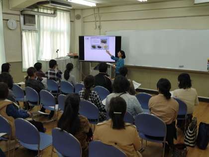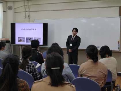 11月4日(金)、今日は保護者対象の「PTA学校給食試食会」を開催しました。まず視聴覚室で、PTA会長、副校長先生の挨拶、担当栄養教諭から当日の流れや献立の説明、日頃の食育についてのお話の後、児童たちと一緒に給食を試食していただきました。献立は、「肉うどん、あっさりきゅうり、りんご、パンプキンパン、牛乳」でした。