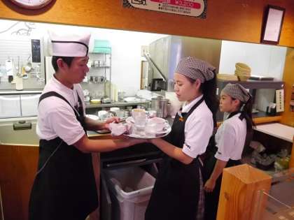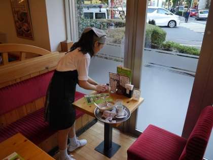 今日は第1日目で、当然のことですが生徒たちは非常に緊張しているようすです。みんな、懸命に説明と指示を聴き、仕事の手順を覚えていました。コーヒー専門店では、揃いの衣装を貸していただき、お客様に対応する姿は、店員さんと間違えるほどでした。テーブルの清掃や、店内の整理整頓などのお手伝いをさせていただいていました。それぞれに緊張の初日を終えました。他の事業所のようすも、順次アップさせていただきたいと存じます。