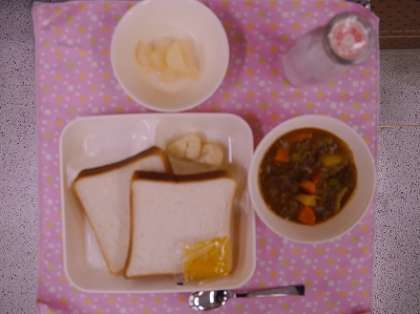 笑顔いっぱいに、満足そうに食べていました。今日の献立は、「ビーフシチュー、カリフラワーのピクルス、和なし、パン、牛乳」 です。