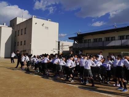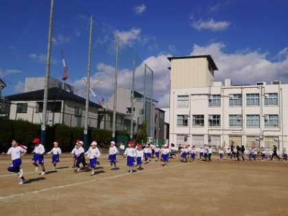 運動場では、準備体操として、音楽に合わせ「むくのき体操」を行ったあと、透き通る青空のもとみんな素晴らしい走りをみせてくれました。トラックを2周、3周と走るうち、白い息とともに体はポカポカと温まっているようすでした。大会に向け、友だちと励ましあいながら、体力作りをしてゆきましょう。