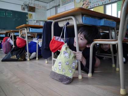 サイレンが鳴り「ただ今地震が発生しました」の放送で児童・生徒たちは即座に机の下に避難し、速やかに運動場に移動しました。点呼による人数確認の後、校長先生から次のとおり講話がありました。