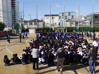 その後、校舎の3階に避難し、人数確認の後、各先生から震災時のようすや、自分の命を守ること・安全行動についてお話がありました。