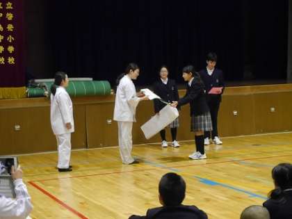 また、生徒たち全員が感謝の気持ちを込めて、給食調理員さんへメッセージカードを書き、代表の方に手渡しました。調理員のみなさん、毎日美味しい給食を作っていただき、本当にありがとうございます。