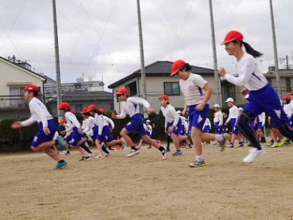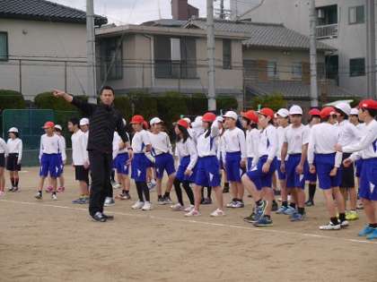 体育館では、荒川さんの子ども時代の経験談を聴かせていただき、興味をもったことを本気で取り組むことが夢につながる、と教えていただきました。その後、運動場で速く走ったり、高く跳ぶための姿勢、足の上げ方、動かし方、走るイメージなど様々なことを教えていただき、一緒にジャンプ、ダッシュを行いました。子どもたちはとても嬉しそうでした。最後には、記念撮影をして終了しました。