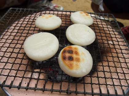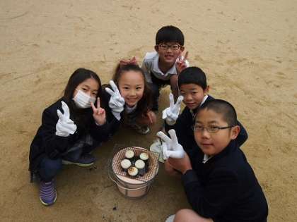 1960年代までは、どこの家庭でも日常的に使用していた「七輪」ですが、児童たちは七輪を見るのも、木炭に火をつけるのも初めてです。地域の学習サポーターの方が、使い方を丁寧に教えてくださり、丸めた新聞紙、その上に小さな木片、木炭をのせ、マッチで火をつける作業を行いました。なかなか木炭に火がうつらず、苦労しているようすでしたが、なんとか木炭に火がうつり、七輪でふっくらと焼けたお餅の味は、最高でした。