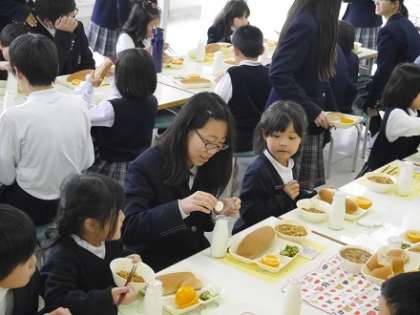 同じテーブルでとなり同士に座り、小学生の児童たちは、あこがれの眼差しで、中学生やのお兄さん、お姉さんにいろいろ話しかけ、お互いに楽しく談笑しながら給食の時間を過ごしました。