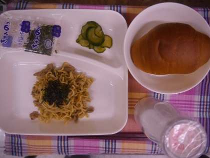 1年生にとっては初めての給食です。先生のやさしいリードにしたがって、手際よく準備ができました。新しい仲間と笑顔いっぱいに、おなかいっぱい食べました。今日の献立は、やきそば、きゅうりのしょうがづけ、パン、牛乳です。特に「やきそば」は、おかわりの行列ができていました。