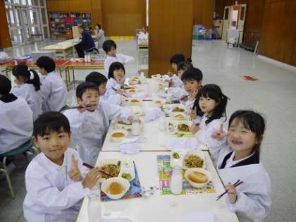 明日は、「入学祝い献立」のカツカレーライス、フルーツ白玉、ミニフィッシュです。楽しみにしていてくださいね。