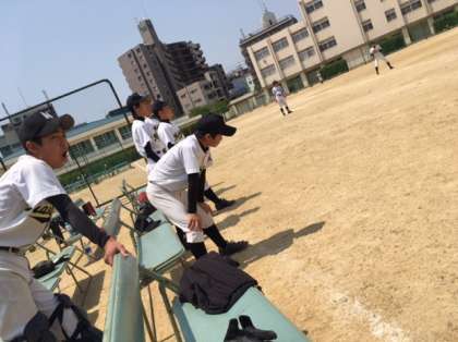 新入生も入り、今年度初となる公式戦ともあり、アップから気合十分。第2試合、豊中市立第十二中学校と対戦。円陣の声が校舎に響きわたる中、試合が開始されました。1回の表から3得点と出だしは好調でしたが、守備はエラーやミスが続いたりと、思い通りのプレーができないところもありました。しかしながら、なんとかチームでカバーしあい、