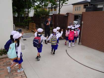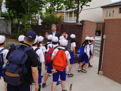 5月10日(水)、昨日からの雨は上がり、晴れ間が見える涼しい朝となりました。今日は1年生、4年生、5年生のみなさんが、昨日に引きつづき校外学習に向けて元気に出発しました。 出発前に、担当の教職員から「交通ルール」、「乗車マナー」「水分補給」等の諸注意があり、児童たちは元気に返事をしていました。
