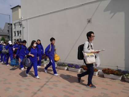 5月11日(木)、初夏の到来を感じさせる素晴らしい青空の朝となりました。7年生のみなさんは、今日から一泊移住です。教室で出発式を行い、元気に出発しました。