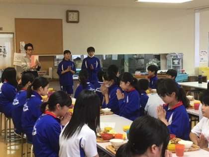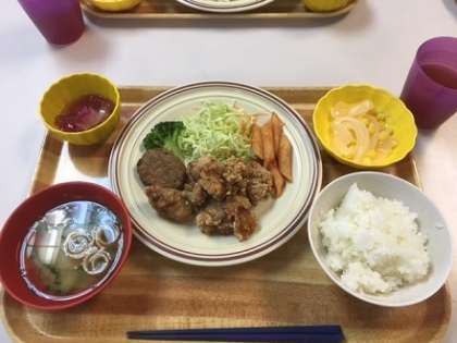 今夜のメニューは、ハンバーグ、から揚げ、マカロニ、たまねぎとコーンのサラダ、みそ汁、漬物、フルーツゼリーのデザートなどで、生徒たちには大満足の献立でした。ごはんもたくさんおかわりしていました。クラスの仲間で会話を楽しみながらいただく夕食は、美味しさも倍増している様子でした。