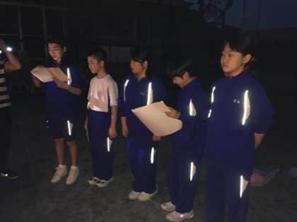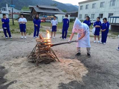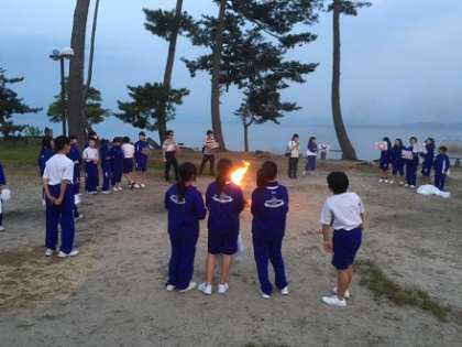 時折、強風が吹く中、火の神による迎え火の儀式でキャンプファイヤーは無事点火され、係生徒の一生懸命な進行のもとで次々にクイズや心理ゲームなどのプログラムが進んでいき、最後に消えゆく炎を囲み、みんなで「キセキ」を歌いました。いっぱい笑った楽しい時間はあっという間に過ぎ、泊行事ならではの素敵な思い出が残りました。