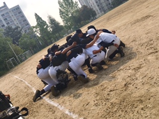 2試合目、山田中学校との試合。昨年度の大阪中学校秋季総合体育大会軟式野球の部(秋季府大会)の優勝校ともあり、緊張しつつも「楽しむ野球をしよう!」といつも以上に声が出ていました。圧倒的な部員の応援や個々の実力に負けじと、中島中学校らしい元気さ、声のかけあい、チーム力でなんと、5−3で勝利しました。強豪校だからこそ勝利の喜びが大きかったのかもしれませんが、また課題も見えました。