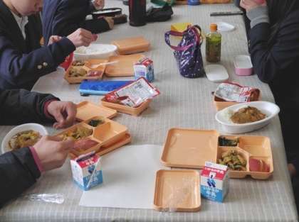 平成26年4月から、中学校新2・3年生の給食については、家庭弁当との選択制、新1年生は全員喫食になります。中学校給食の申込・お支払方法が変わりますが、詳しくは本日配付したプリントと4月分献立表をご覧ください。
