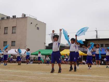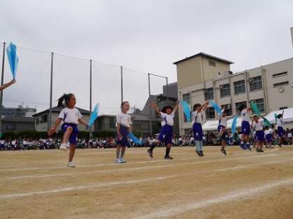 1・2年生の団体演技です。素敵な笑顔でいっぱいのダンスです。心を一つに毎日練習がんばってきました。元気な子どもたちの歌声、はつらつとしたダンスの格好よさ。観客の皆さんも、癒されるダンスに自然と笑顔になり、会場すべてが温かな気持ちになりました。