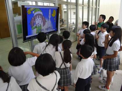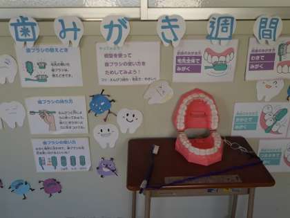 保健室前では、歯磨き指導模型が置かれ、子どもたちは一生懸命大型歯ブラシで磨く練習をしていました。また、本校では異学年交流として、ペア学年で一緒に給食を食べる「なかよし給食」を実施しており、ランチルーム前ではペア学年で一緒に歯を磨いていました。