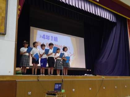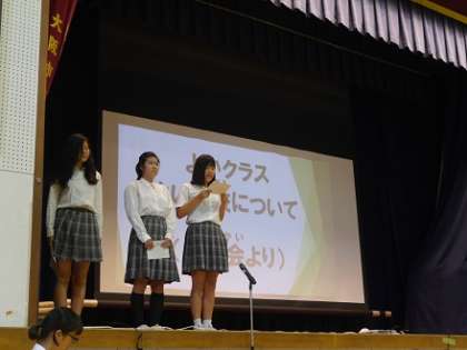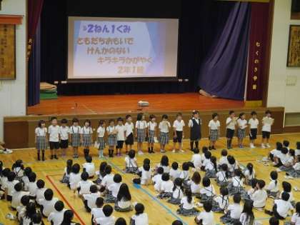まず1年生から順番に、年度当初にたてたクラス目標を発表 していきました。各クラスとも、堂々と元気いっぱいに発表してくれました。また、7年生から9年生では、生徒会より「よいクラス・よい学園」にするため、アンケート結果を交えながら、「むくのき学園」のよいところや課題を出し合いました。