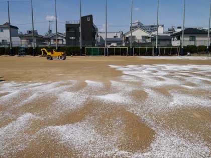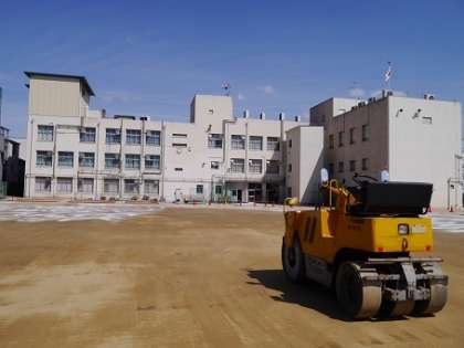 4月3日(木)、工事車両の出入りなどでぬかるんでいた運動場は、天候の影響もあり整備が少し遅れています。何度も土を補充しながら、幾重にも重ねてローラー車で固め、白い粒状のニガリを撒いて、急ピッチで整地していました。