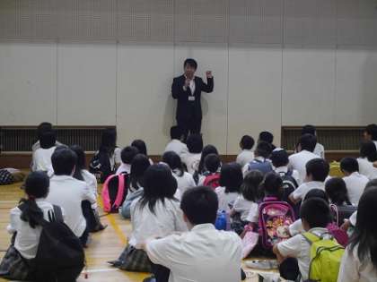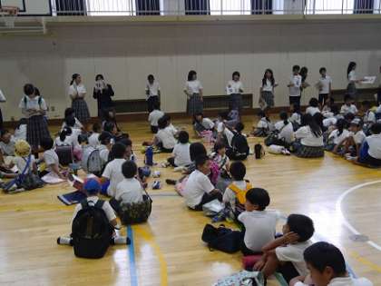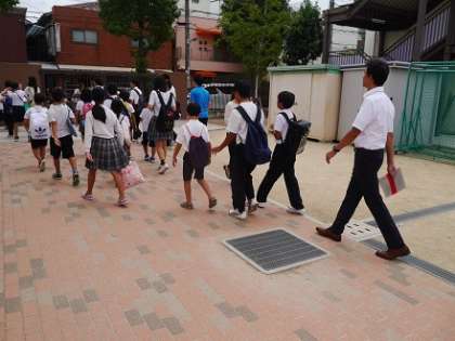 25日(金)の始業式、学級活動の終了後、台風を想定した「避難訓練」を実施しました。体育館では、毎朝の集団登校のグループごとに分かれ、人数点呼を速やかに行いました。副校長先生からの講評の後、集団下校を実施しました。