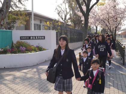 4月9日(水)、、阪急「柴島駅」に集合した児童生徒は、昨日の「地域子ども会」で選出された上級生の班長・副班長さんが先導し、教職員の見守りの中、手をつないで集団登校する姿は、ほのぼのとした光景です。
