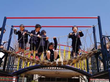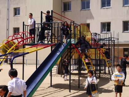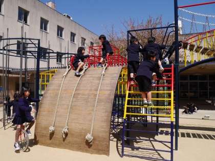 4月15日(火)、昼休みは児童たちの歓声がこだまする時間帯です。中でも低学年の児童たちに人気があるのが、中庭にあるジャングルジムや滑り台などのコンビネーション遊具です。登っては滑り、降りては登り、くぐってすり抜けたり、縦横無尽に駆け回る姿は実にいきいきとしています。休憩時間が十分取れないので、先生の 「教室に戻りましょう」 の呼びかけに、それぞれが物足りなさを感じるくらい、パワー全開の楽しいひとときを過ごしています。