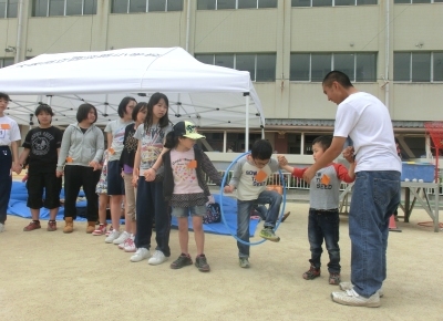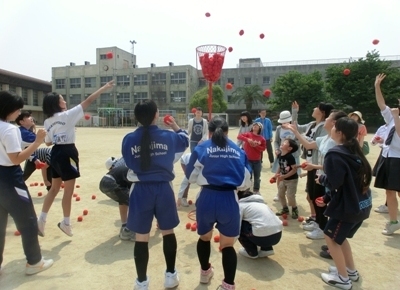 東淀川区内の小中学生や柴島高校の生徒と一緒になって、自己紹介の後「伝言ゲーム」や「輪くぐり」、「玉入れ」競技などをして楽しみました。