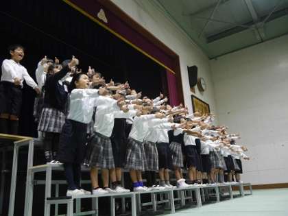 子どもたちが舞台に登場し、学習した国々のことを、英語をはじめとする外国語を交えながら、持ち前の元気な歌声とともに楽しく届けてくれました。