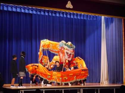 ■マジワルワールド/朋友の発表は「Give me 5〜世界の友だち〜」です。世界の子供たちの遊びを披露してくれました。皿まわし、サッカー、雪合戦、盆踊りなど。遊びにつづいて龍舞の披露です。大きな龍をたくさんの人数で舞わせます。龍に生命をあたえることはできたようですね。