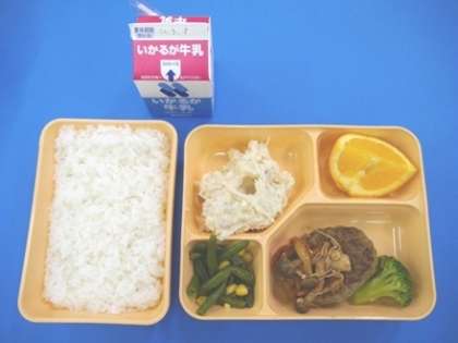 5月1日(木)、小学校給食【写真左】は「こどもの日の行事献立」で、笹の葉に包まれた「ちまき」と、牛肉のちらしずし、五目汁でした。中学校給食【写真右】は、煮こみハンバーグ、じゃがいもの鮭マヨ炒め、三度豆のソテーでした。
