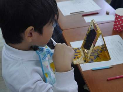 歯科衛生士さんの楽しく分かりやすいお話で「虫歯」や「歯こう」について学んだあと、歯こうを赤く染めだす色素を歯に塗ってもらい、自分の歯の状況を確認しました。鏡をのぞきこみ、真っ赤に染まった歯を見て、「わーっ」と驚きの声があがりました。