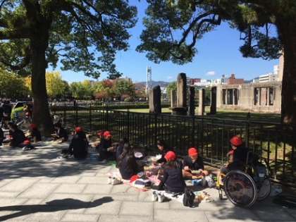 午後、平和記念公園そばの宿舎に大きな荷物を預けて公園内へ。各自で用意をしてきたお弁当をいただいた後、原爆ドームをバックに集合写真を撮りました。目の前に迫る原爆ドームの悲しき姿からは、72年前の惨状を今に伝える無言の迫力が感じられました。