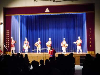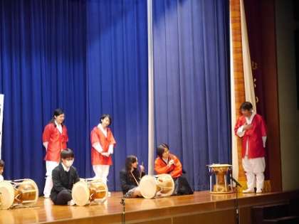 楽器の紹介や演劇、そして代表生徒が太鼓のリズムを体験する場面もあり、大きな拍手を得ていました。