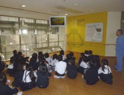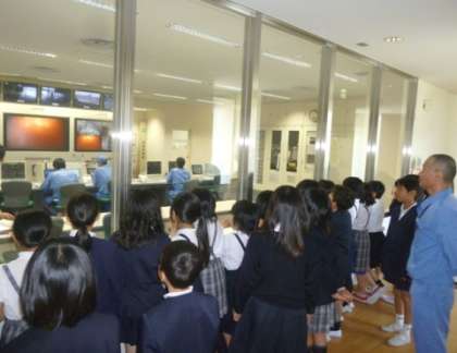 児童たちは、先日パッカー車を見学し、ごみの収集には多少事前学習していたとはいえ、1日に320トンもの可燃性のごみを焼却できる工場の大きさには、びっくりしていました。次々にプラットホームへ入るパッカー車から投入されるごみが、公害防止対策を施され、焼却工場で適切に処理される工程を見学させてもらいました。