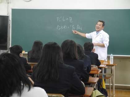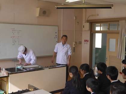 教室で行われた講義では、大阪の歴史とともに、出汁の文化や大阪発祥の料理について、とてもわかりやすく説明していただきました。講義の後、家庭科室では、大阪割烹料理の一部を実演していただき、鱧の骨切りなど料理のようすを間近で見学しました。