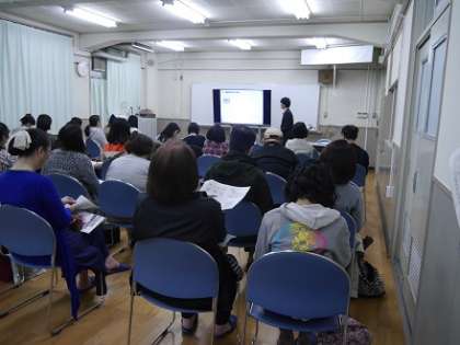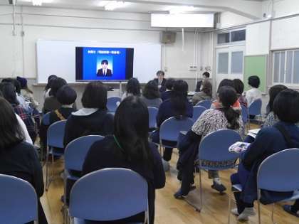 進路説明に先立ち、東淀川区内にある大阪府立北淀高等学校・大阪府立柴島高等学校の学校説明会を開催 し、電子黒板やビデオを交えそれぞれの学校概要に関する説明をいただきました。