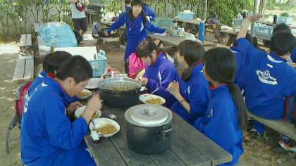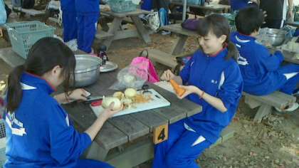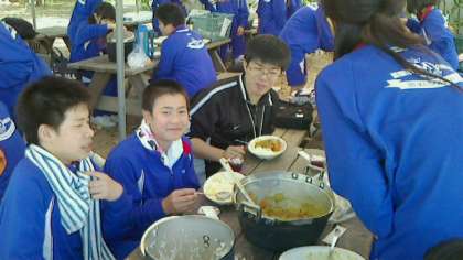 今日の活動のメインである「野外炊飯」に取りかかりました。各班では、かまど係と調理係が連携しながら、おいしいカレーライスづくりに挑みました。カレールーやご飯の出来映えはさまざまでしたが、みんなで協力して楽しそうに取組んでいました。みんなで作ったカレーライスの味は格別のようで、班ごとでいただく時には、終始満面の笑みがこぼれていました。