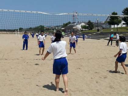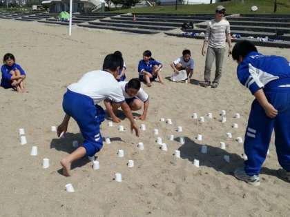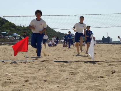 その後は、レク係の進行で「レクレーション in 里海公園」と題する活動を行いました。「ビーチバレー」「フラッグ・アタック」「紙コップ大決戦」「ジャンケン・ドラクエ」などの種目で、班対抗戦に挑みました。童心に返って砂浜の公園で講じるゲームは、次第に白熱の様相を見せてきました。ここでは早くもパワー全開です。