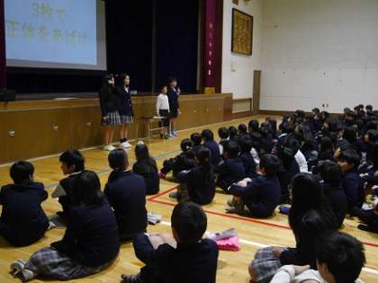 12月8日(金)、 今日は真冬を感じさせる冷たい雨の朝となりました。1〜6年生の児童集会が体育館で行われました。