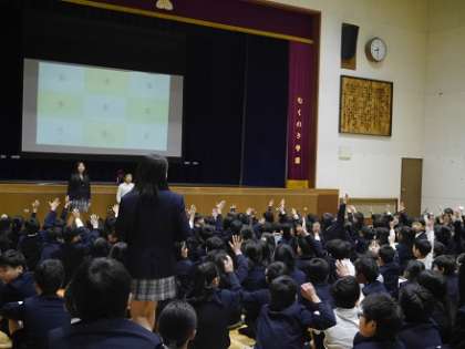 児童集会では、「ともだち’S 委員会」がリーダーシップをとります。仲間づくりを目的とし、楽しいゲームを考え、自分たちで司会もします。和やかな雰囲気で1年生から6年生の友だちの輪がひろがっていきました。むくのき学園ではさまざまな仲間づくりの取組がおこなわれますが、このように遊びの中で強められる絆も大切なつながりだと考えます。今日のゲームは、は大型スクリーンを使った「3枚で正体をあばけ」というゲームです。元気よくたくさんの児童の手があがりました。