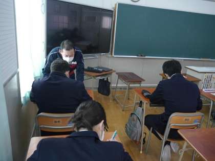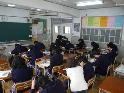 12月26日(火)、今日は美しい青空が広がる寒い朝となりました。今日から冬休みに入りましたが、9年生は、学力補充日としてたくさん学校に登校してきています。志望校の入試対策として、プリント学習や「プレテスト」の実施など、先生に質問したり、集中して学習に取組んでいました。