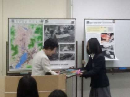 続いて訪ねたのは、原爆資料館でした。まず、会議室で被爆体験者から、ご講話をいただきました。生徒たちは、被爆地長崎で聞く実体験のお話に、原爆の恐ろしさをあらためて知ることとなりました。生徒代表からは、手づくりの平和への誓い作品を御礼にお渡ししました。【写真左】その後、館内で展示物を見学しました。【写真中】当時の悲惨な状況を目の当たりにし、「高校生1万人署名」の手交式も行いました。【写真右】